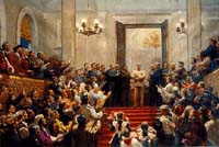 "... Мы пришли от полей и заводов, в наших мускулах сила народа, а на знамени - мир и свобода всем народам земли!.."